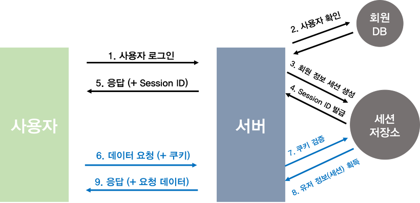 세션 = 매 요청마다 특정 ID 를 쿠키에 담아서 DB 조회후 사용자 인증
