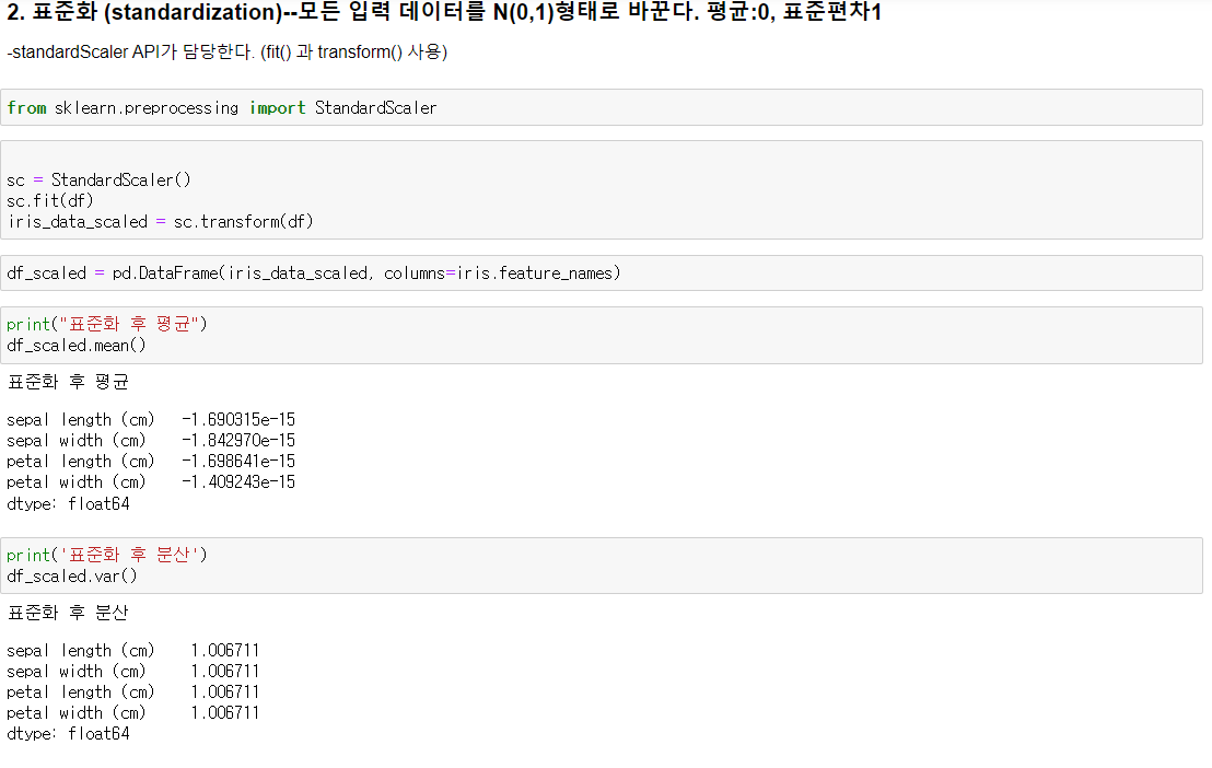 Scaling 에는 평균이 0, 표준편차가 1인 정규분포를 따르게 만드는 표준화,