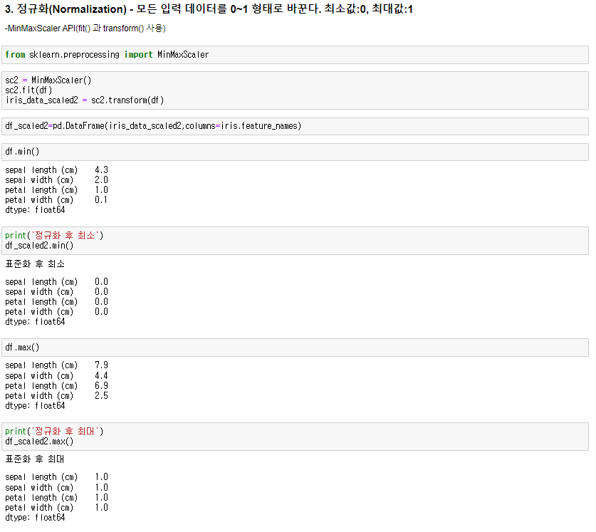 0~1 사이 값만을 가지게 하는 정규화 2가지가 있다.