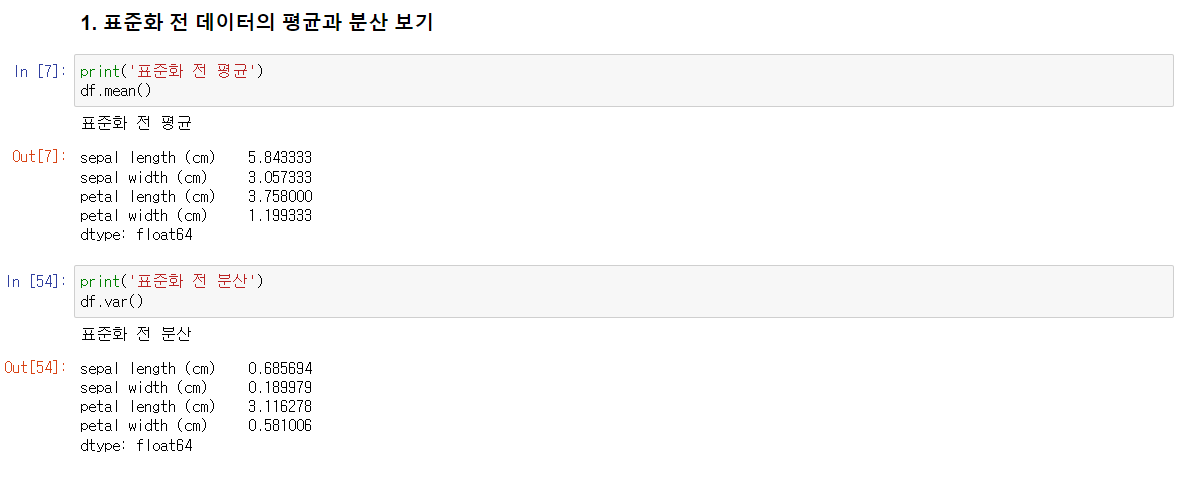 붓꽃 데이터프레임에 적용한 표준화 전 데이터의 평균과 분산은 다음과 같다